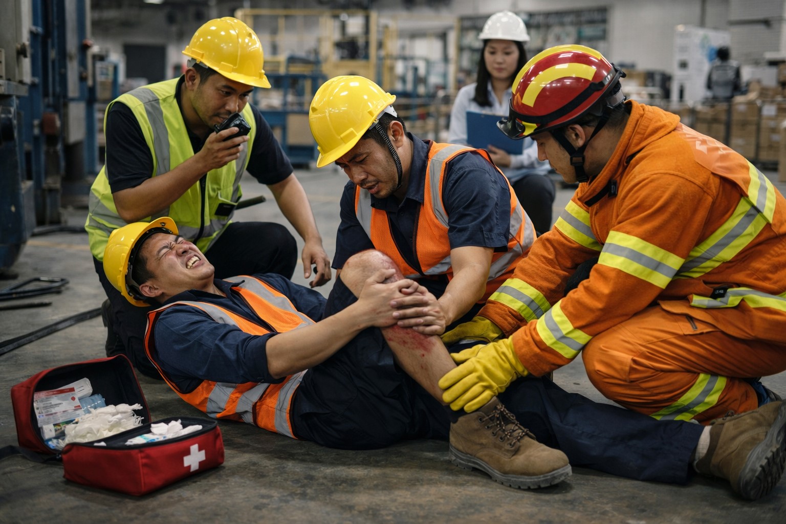 Di sebuah proyek renovasi gedung, seorang pekerja terjatuh dari ketinggian rendah akibat terpeleset. Rekan kerjanya segera menghentikan pekerjaan di sekitar lokasi dan memastikan tidak ada bahaya lanjutan. Pengawas dipanggil dan langsung menghubungi tim medis proyek. Korban tidak dipindahkan sebelum tenaga medis tiba karena dicurigai mengalami cedera punggung.